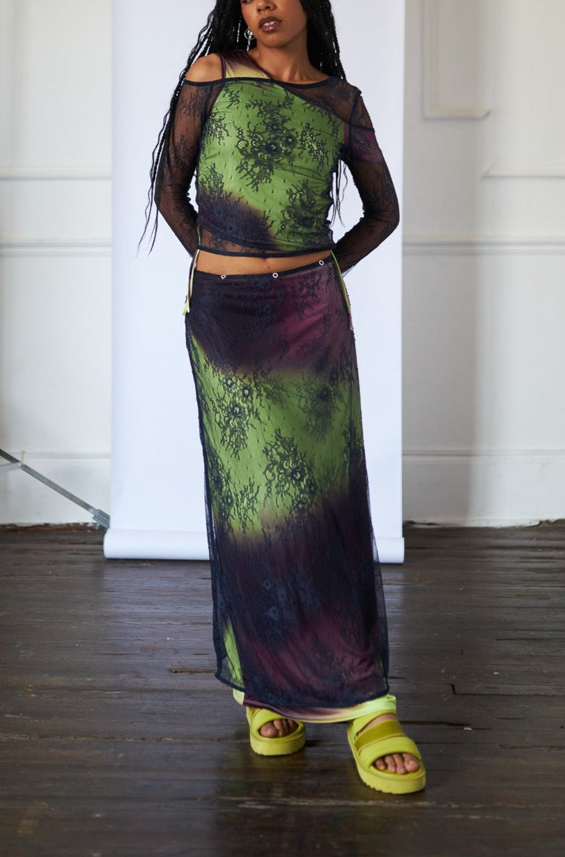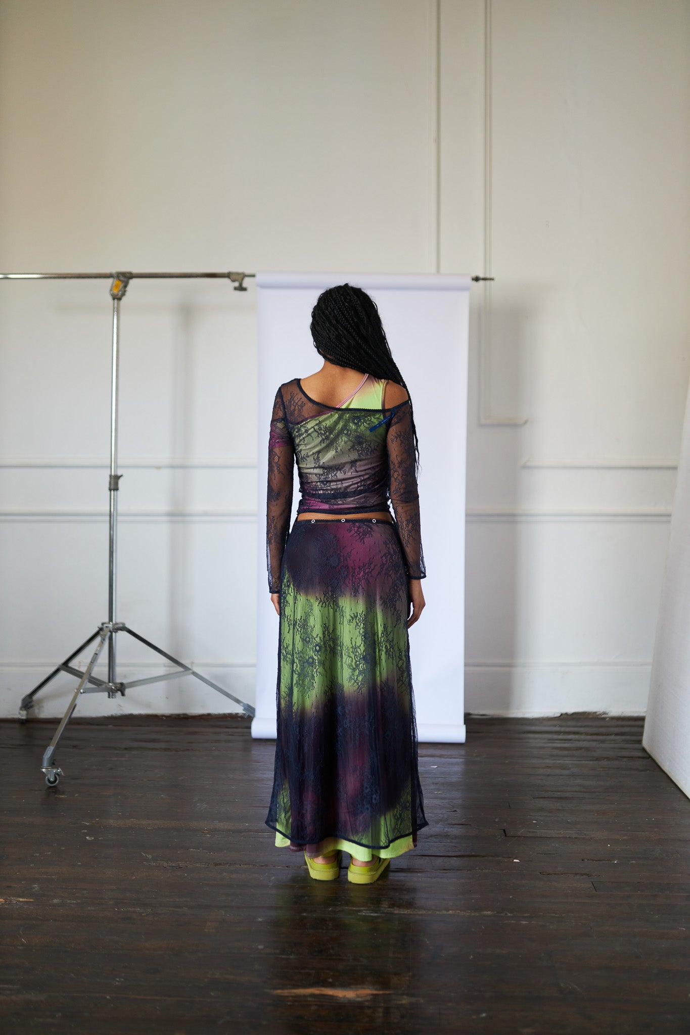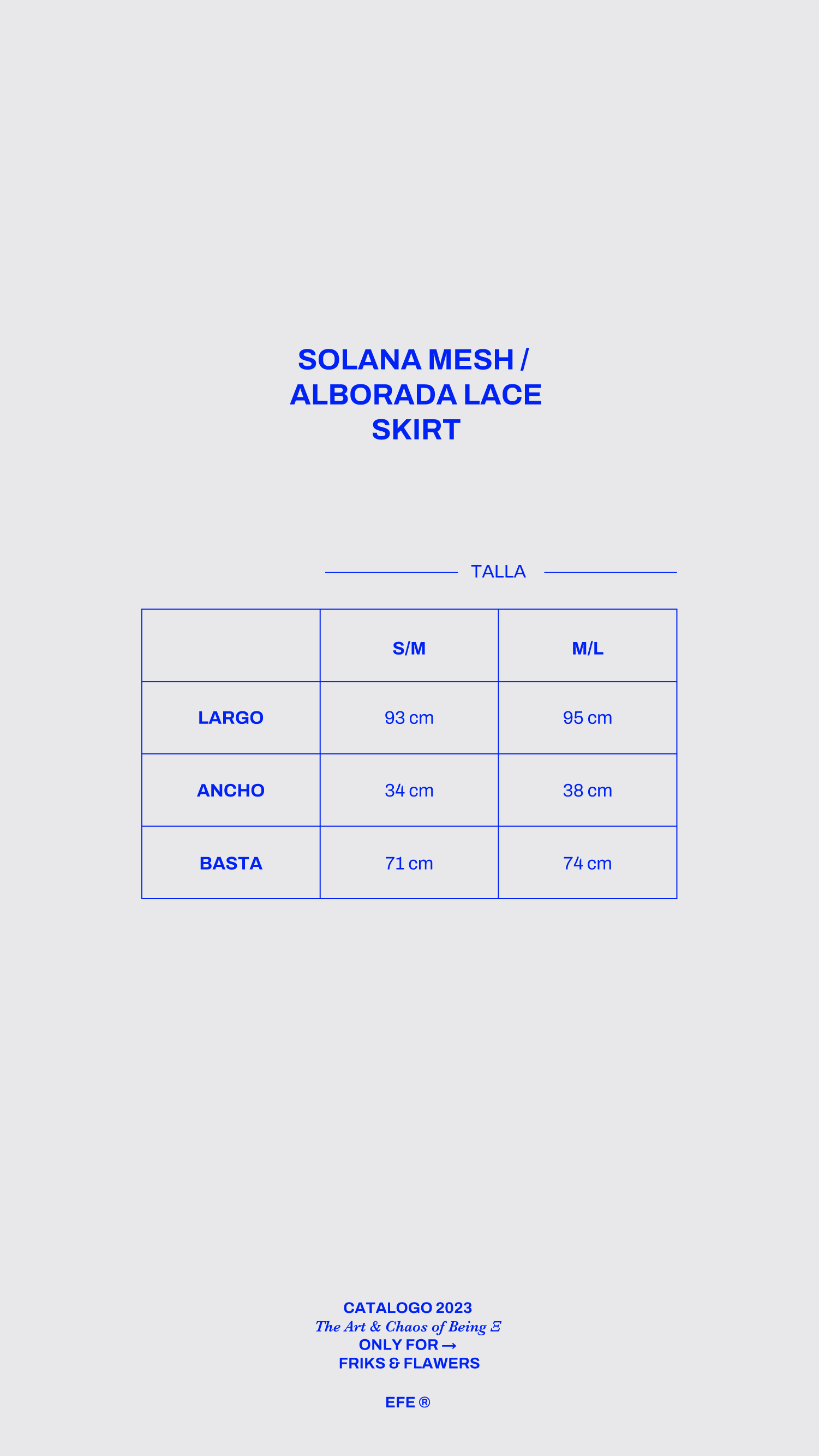Falda larga compuesto por dos piezas separables. Falda base estampada y falda sobrepuesta de encaje //  Detalle de broches en el contorno de la cintura para separar o unir las piezas