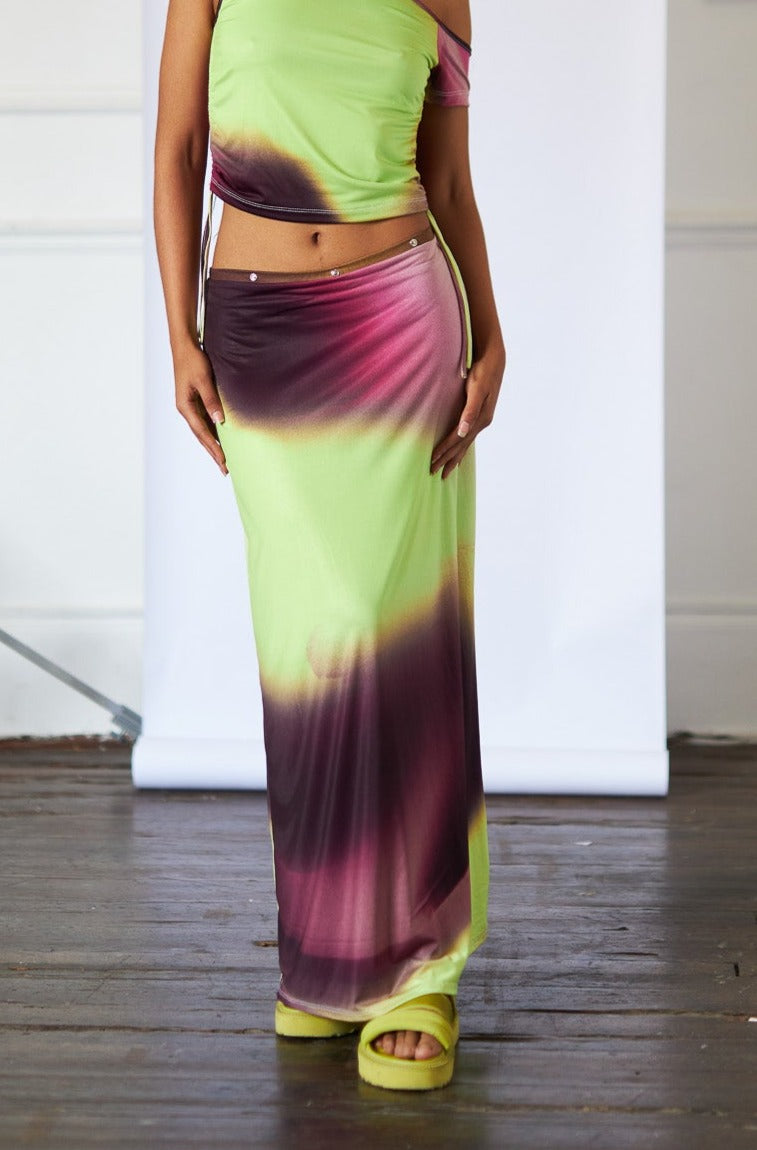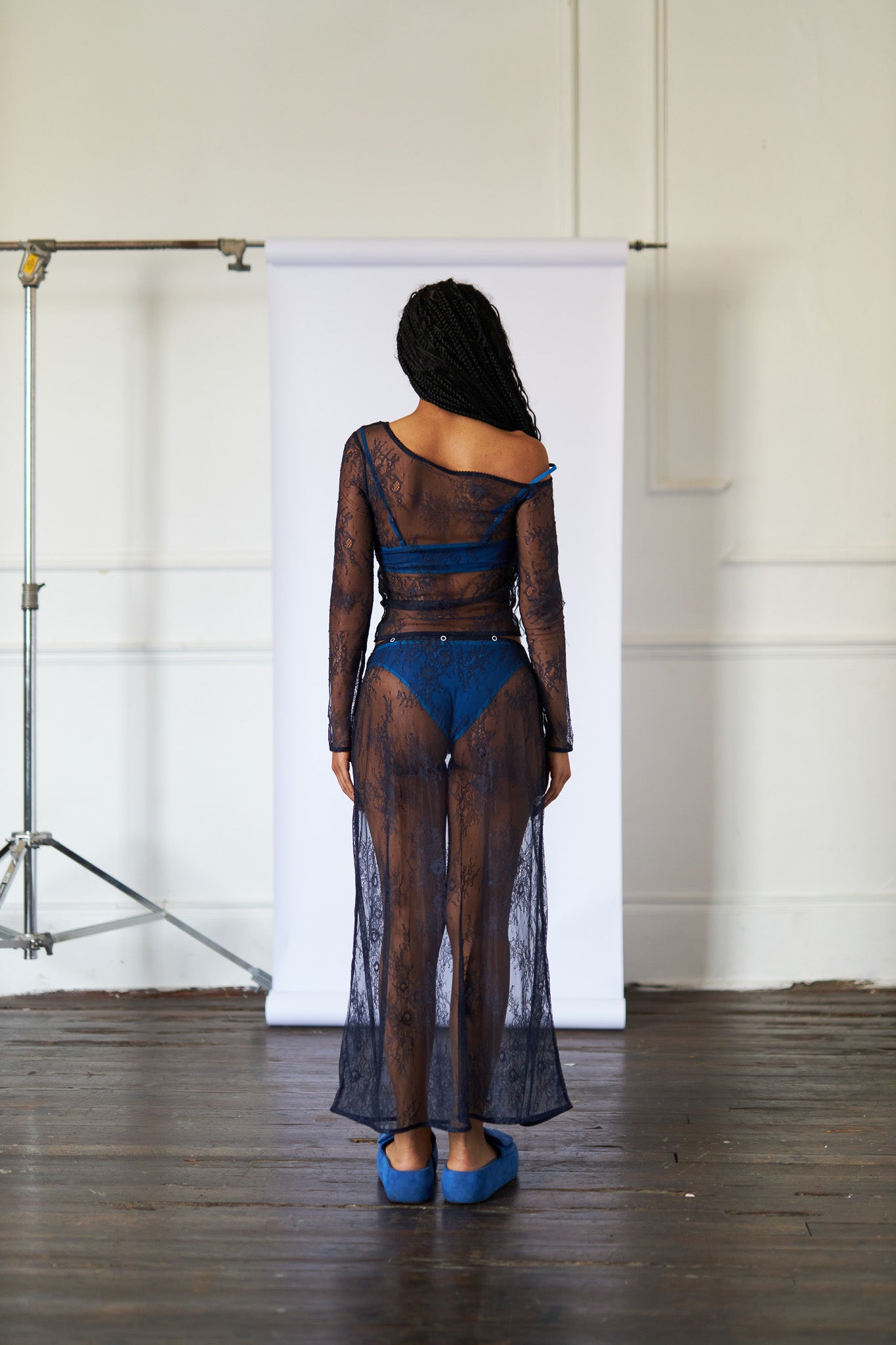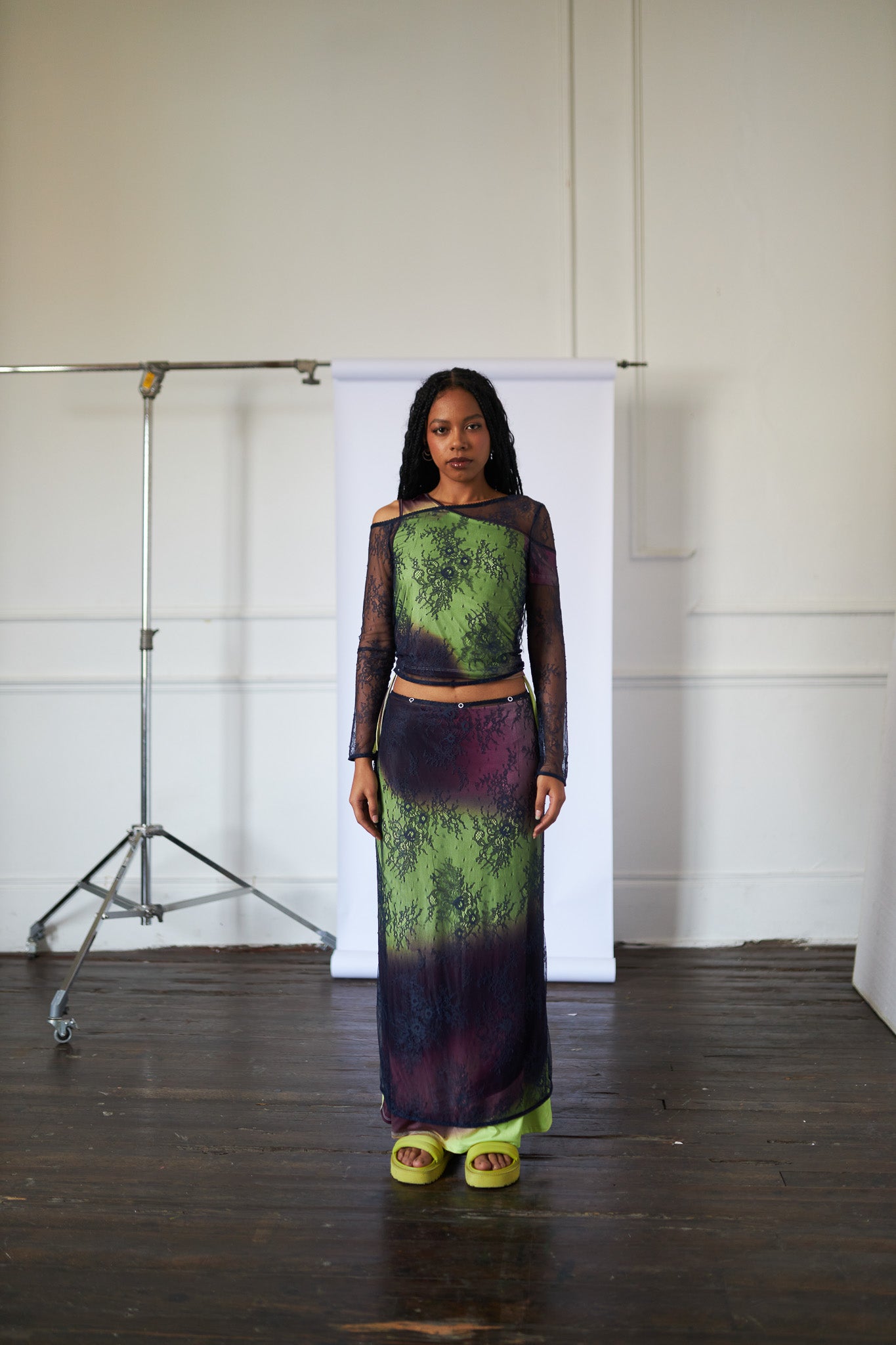 Falda larga compuesto por dos piezas separables. Falda base estampada y falda sobrepuesta de encaje //  Detalle de broches en el contorno de la cintura para separar o unir las piezas