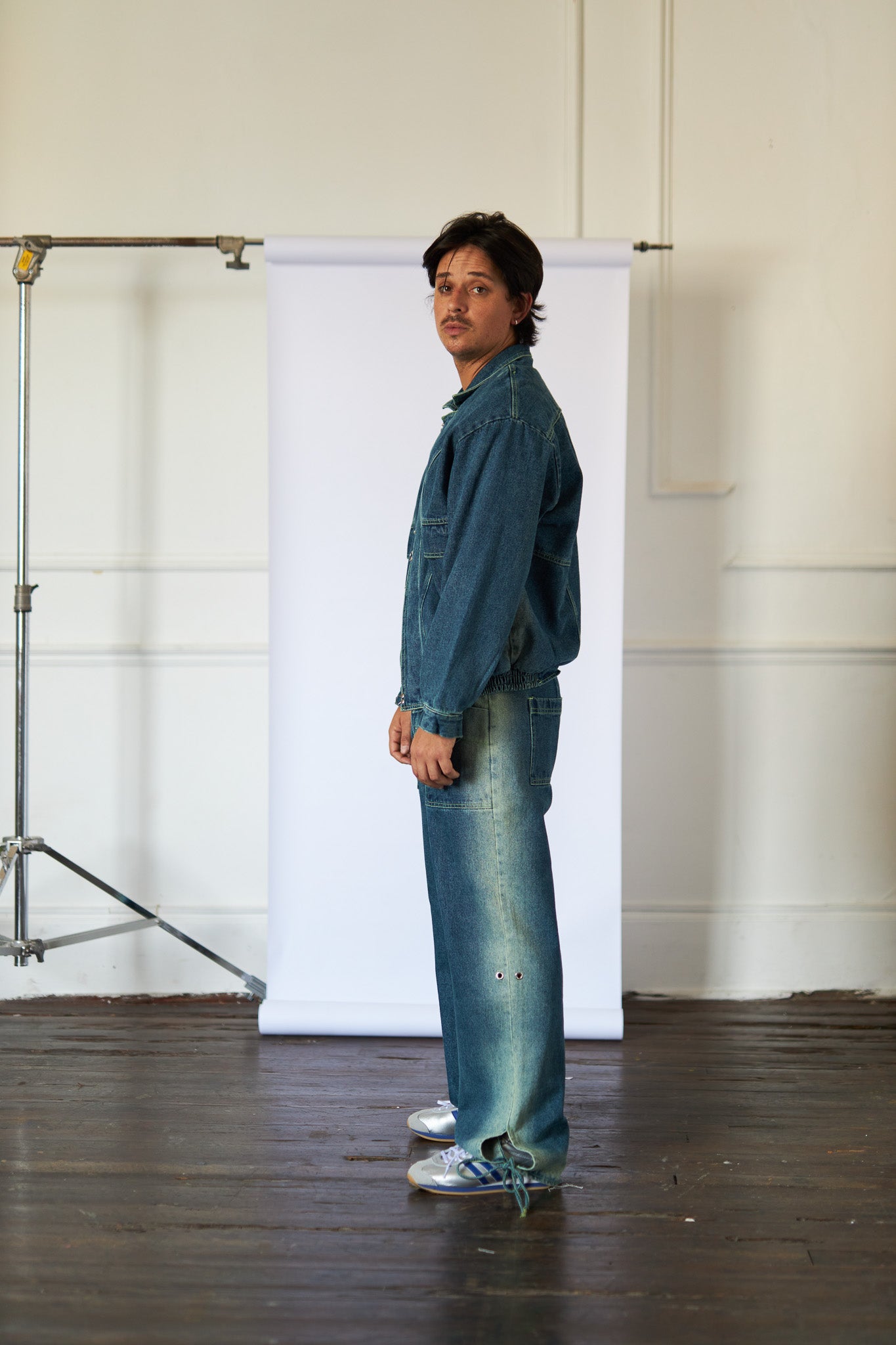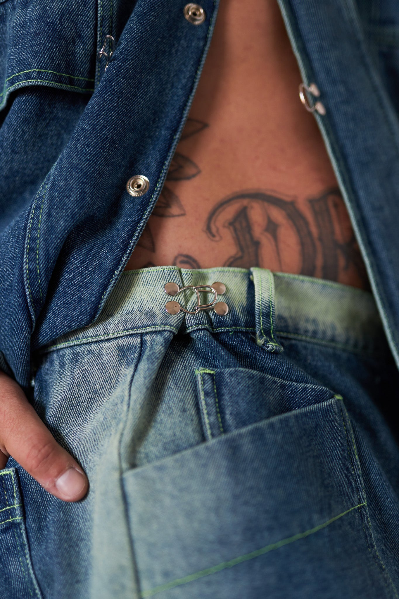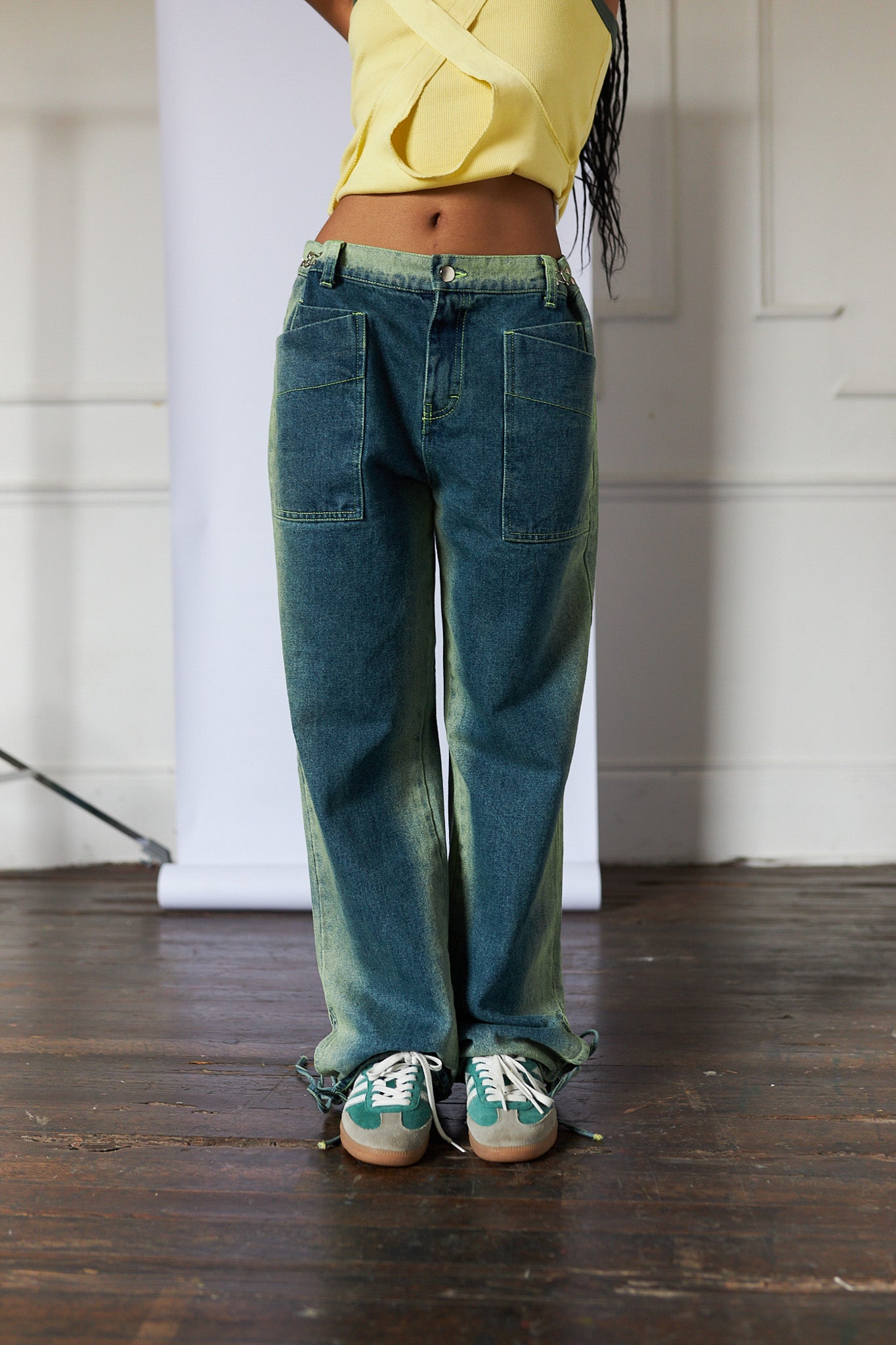Pantalón oversize con enganches en la pretina para regular el tamaño y usarlo a la cintura o a la cadera (ver tabla de madida) y con ojalillo en la basta para regular el largo // Detalle de desteñido en los laterales