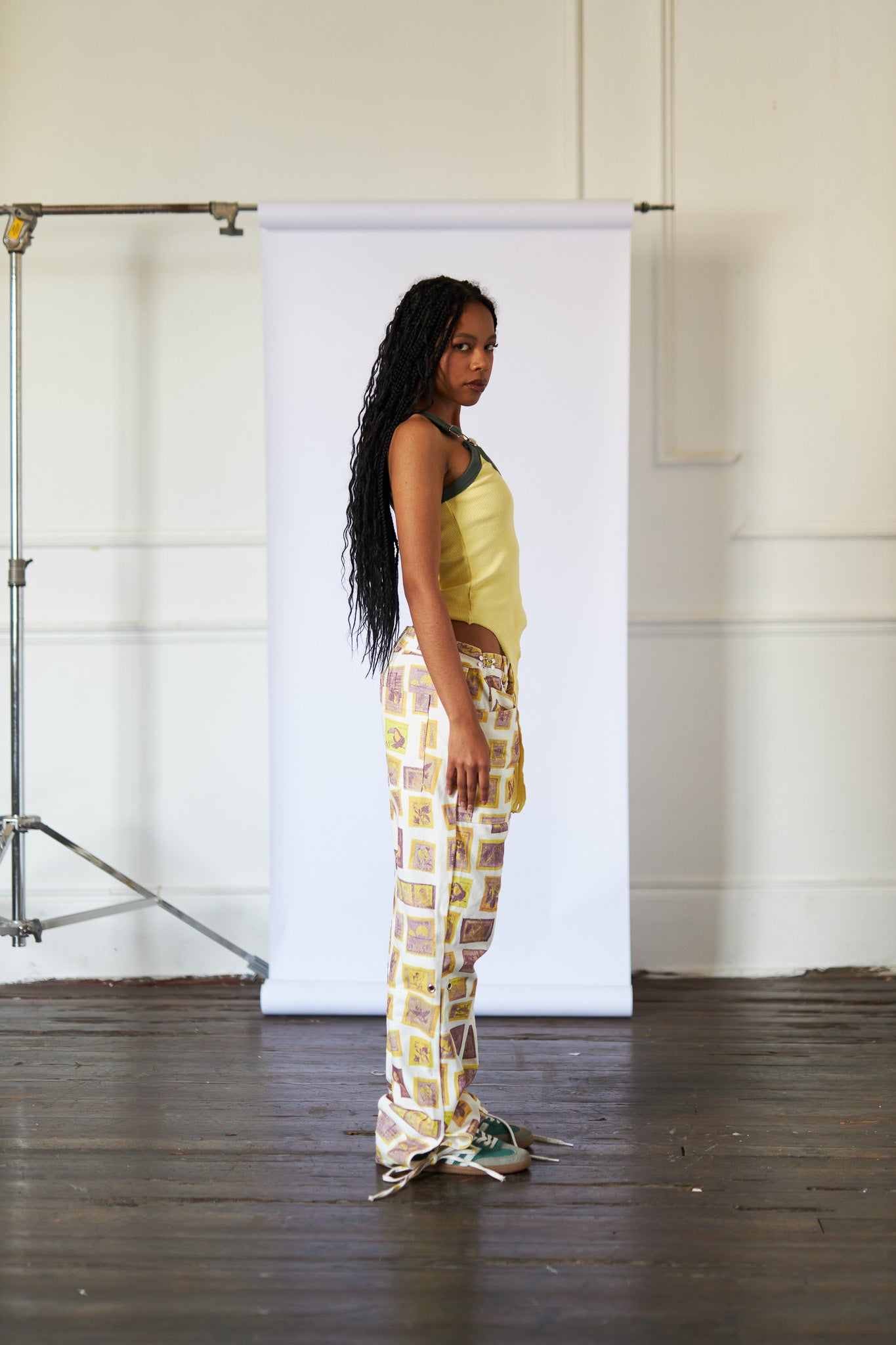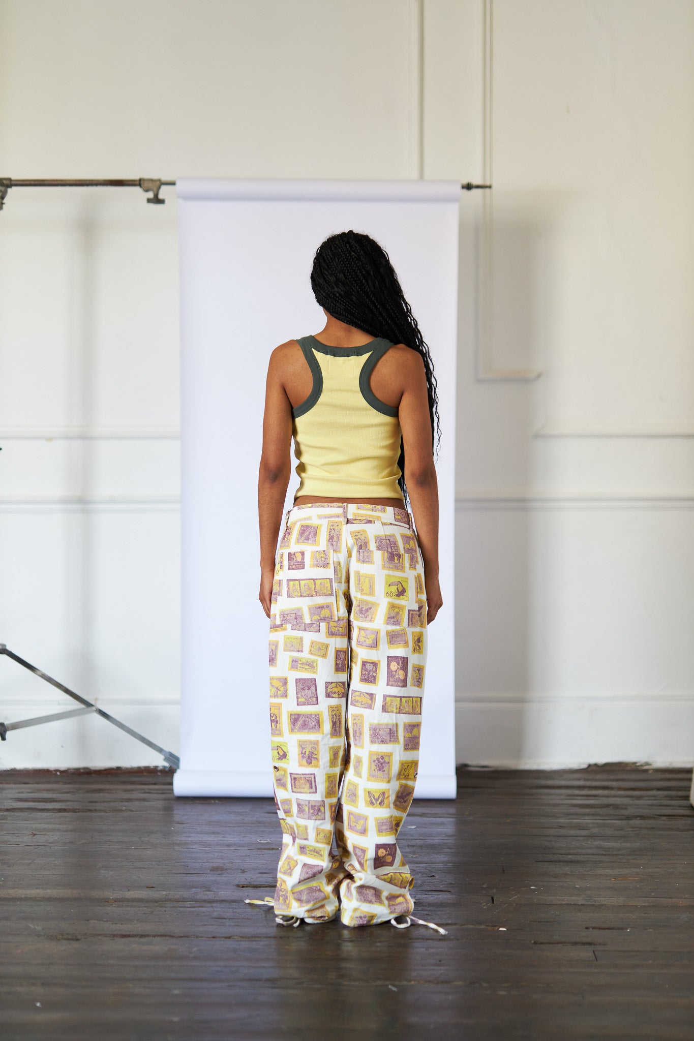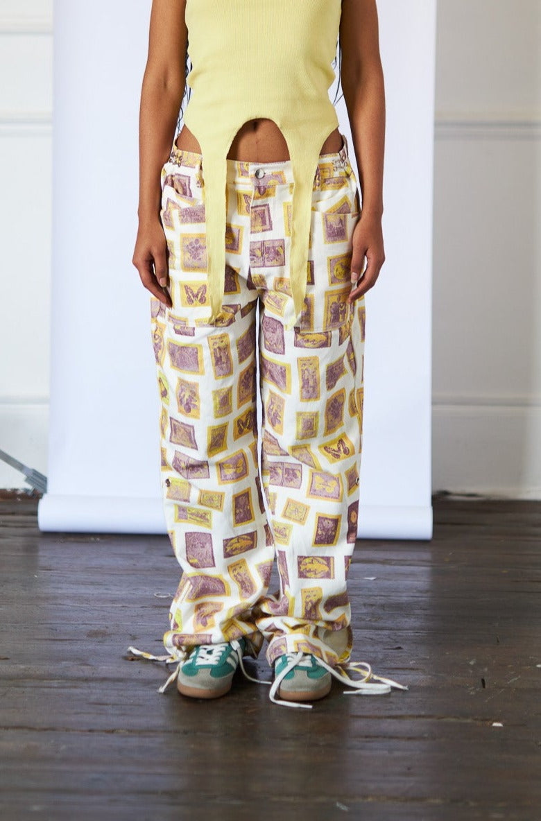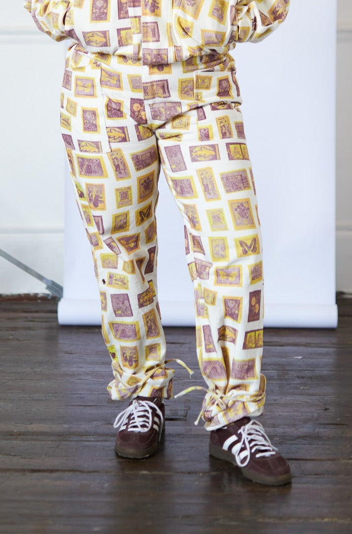 Pantalón oversize con enganches en la pretina para regular el tamaño y usarlo a la cintura o a la cadera (ver tabla de medida) y con ojalillo en la basta para regular el largo // Detalle de estampado con técnica serigrafía